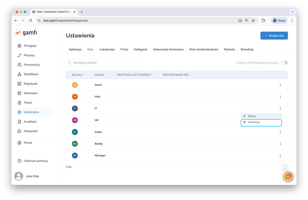 A Role created in the Settings section cannot be permanently deleted, but it can be archived. Simply click the three dots on the right in the list of Roles next to the Role selected for archiving and select the ‘Archive’ option.