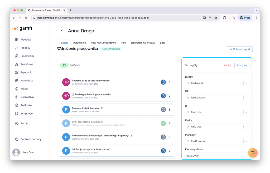 - Initiate downloading a Process progress report for an employee (after generating the report, it will go to the "Analytics" tab and can be downloaded from there).