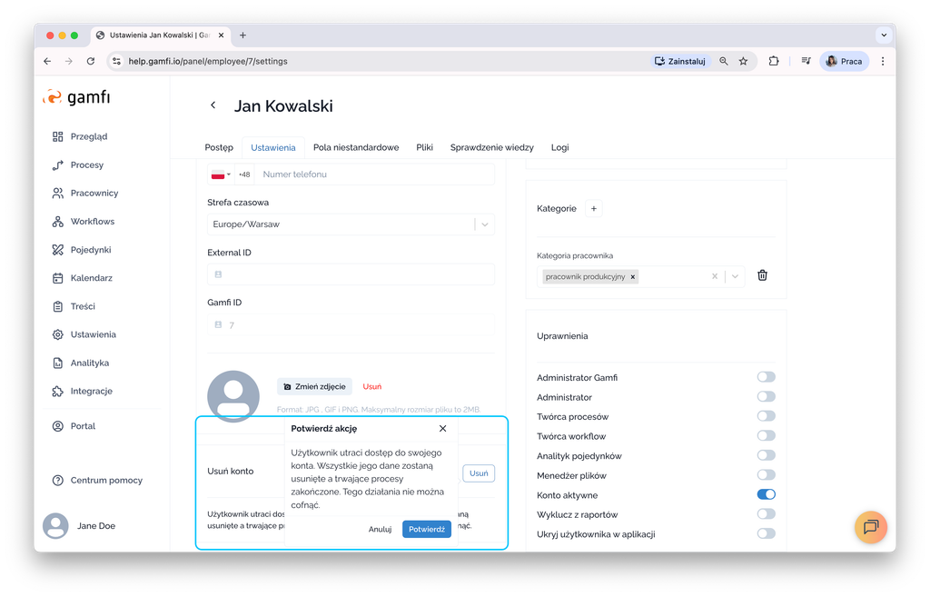 You can delete user account in the"Delete account" box at the bottom of the page - user will lose access to their account. All his data will be deleted and ongoing processes will be terminated. This action cannot be undone.