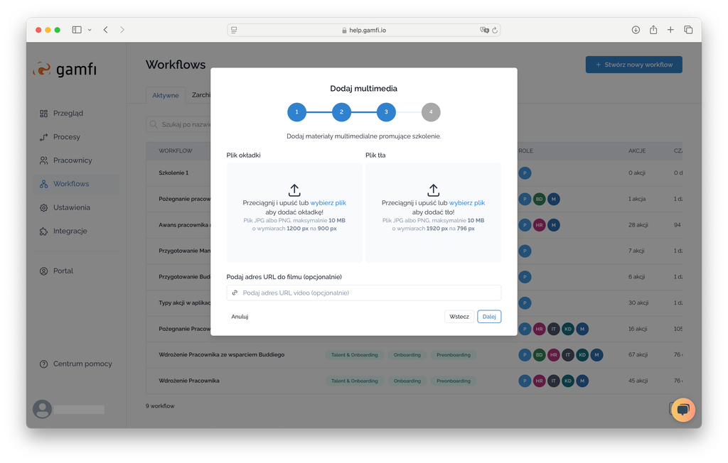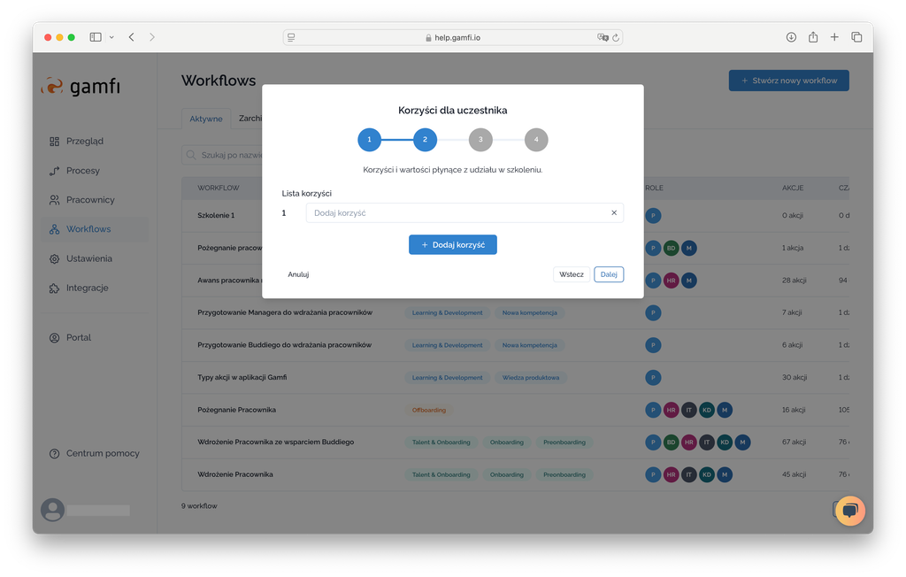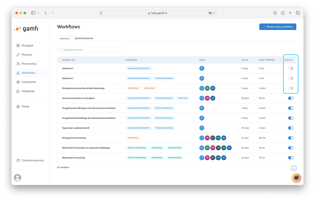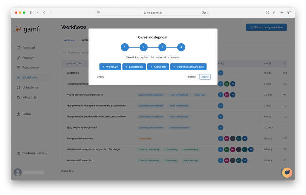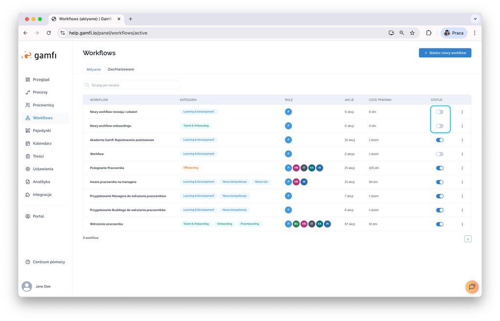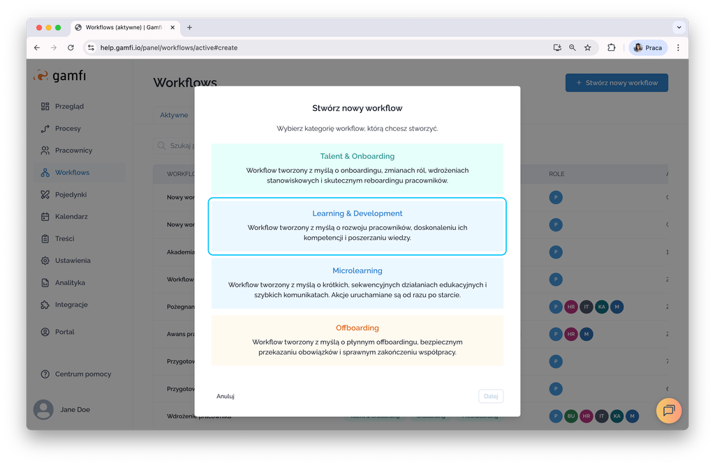 - click the "Create a new Workflow" button in the upper right corner of the screen, and then select the Learning & Development workflow category.