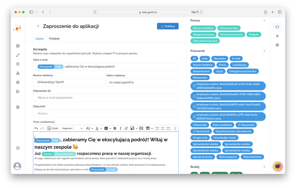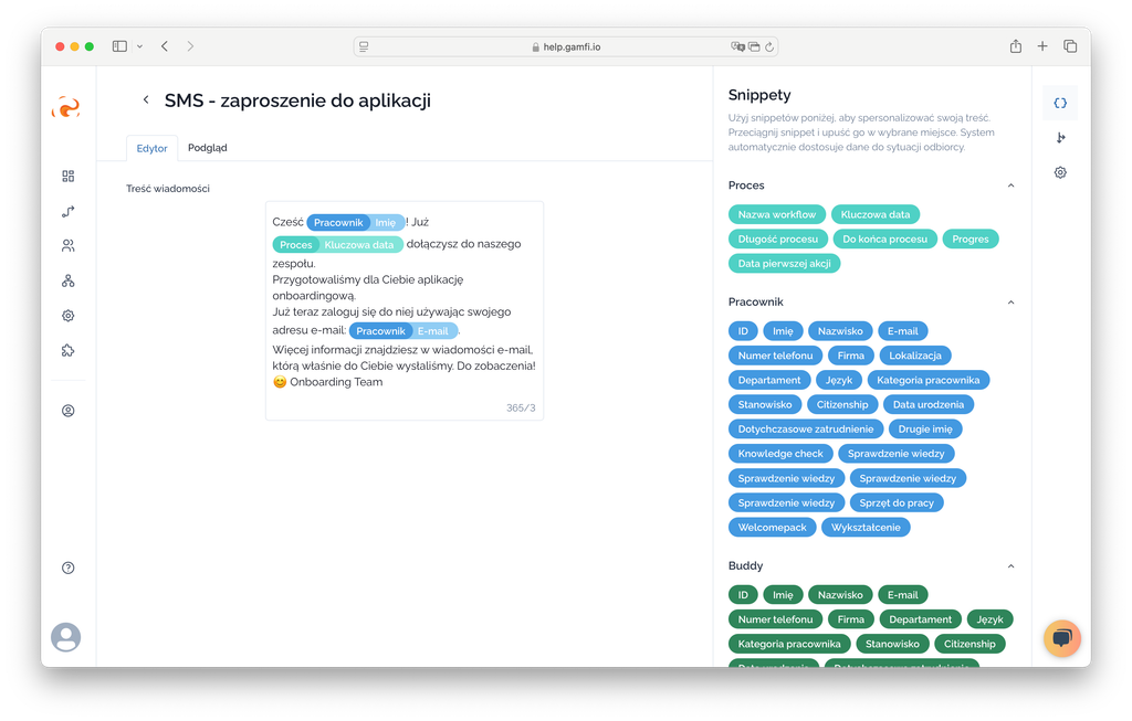 The sender of the message sent in the Process is GAMFI. In SMS Actions, you can use Snippets to personalize the communication.